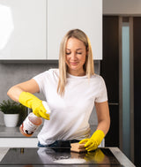 - Pred použitím vždy skontrolujte kompatibilitu materiálov. Pozrite si používateľskú príručku vašich kuchynských spotrebičov, či ich možno použiť s odmasťovačom.